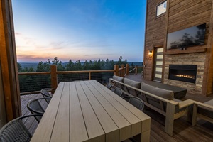 Immerse yourself in the surrounding beauty as the living room offers unparalleled vistas through oversized floor-to-ceiling windows. Gather around the inviting fireplace and relish in family entertainment on the 70” OLED TV, all while luxuriating in the generous sectional and genuine leather chairs. The cabin's furniture, thoughtfully curated by a Dallas interior designer, ensures a serene and unforgettable stay, exuding the charm of elk antlers, large pictures, cement tables, and tasteful decor.