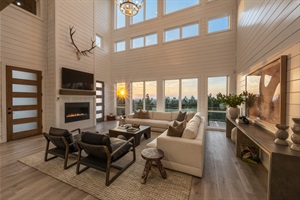 The kitchen flows seamlessly into the living room, which boasts awe-inspiring two-story high ceilings and windows that ascend dramatically from the floor. The grand fireplace complements this design, enhancing the captivating views from both the living room and kitchen.