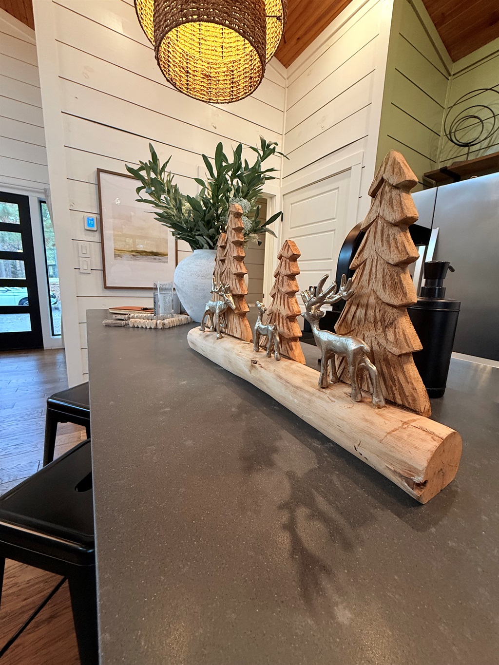 The living area features plush seating, panoramic forest views, and a 20-foot stone fireplace. Enjoy streaming your favorite shows on Smart TVs or unplug with board games and vinyl records for cozy nights in.