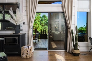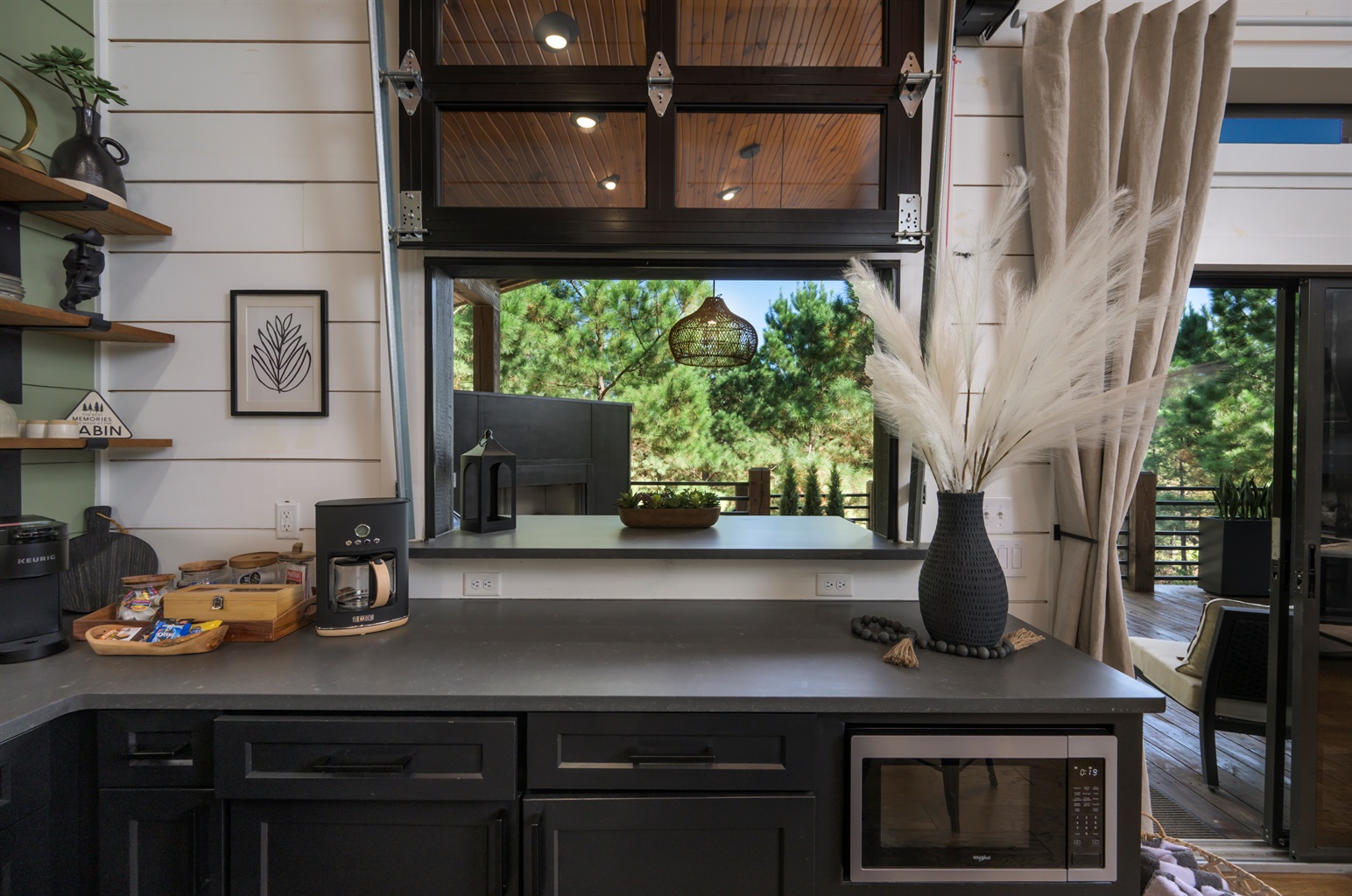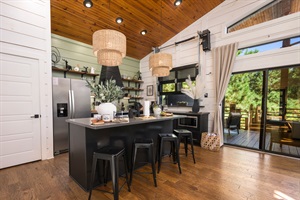 The gourmet kitchen is fully stocked — quartz countertops, stainless appliances, a farmhouse sink, and all essentials including a crockpot, blender, and coffee maker. A garage-style window opens to the deck for seamless indoor-outdoor entertaining.