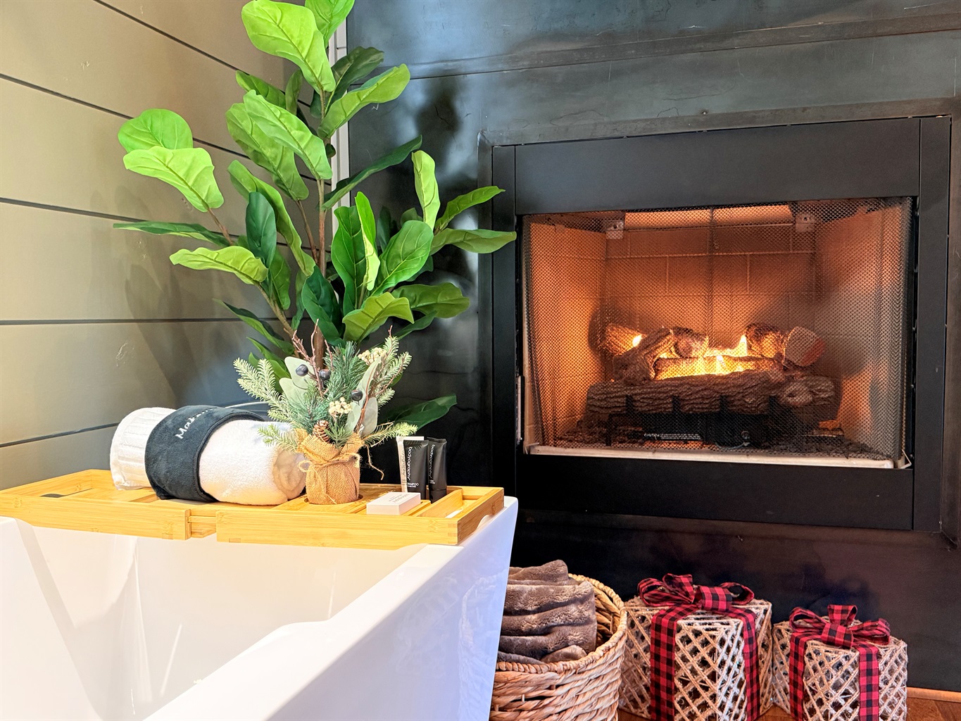 Romantic primary suite with a soaking tub and double-sided fireplace