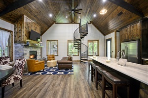 Entering the front door, you will find the open living area and kitchen decorated in an upscale ranch style with leather furniture and beautiful blue and chocolate brown tones throughout. You and your honey (with or without the kiddos) can truly spend quality time together in front of the stone fireplace, watching movies on the 55" TV and playing games. NOTE: Our TVs are Smart TVs so that you can log in with your account and watch your shows via your favorite apps.