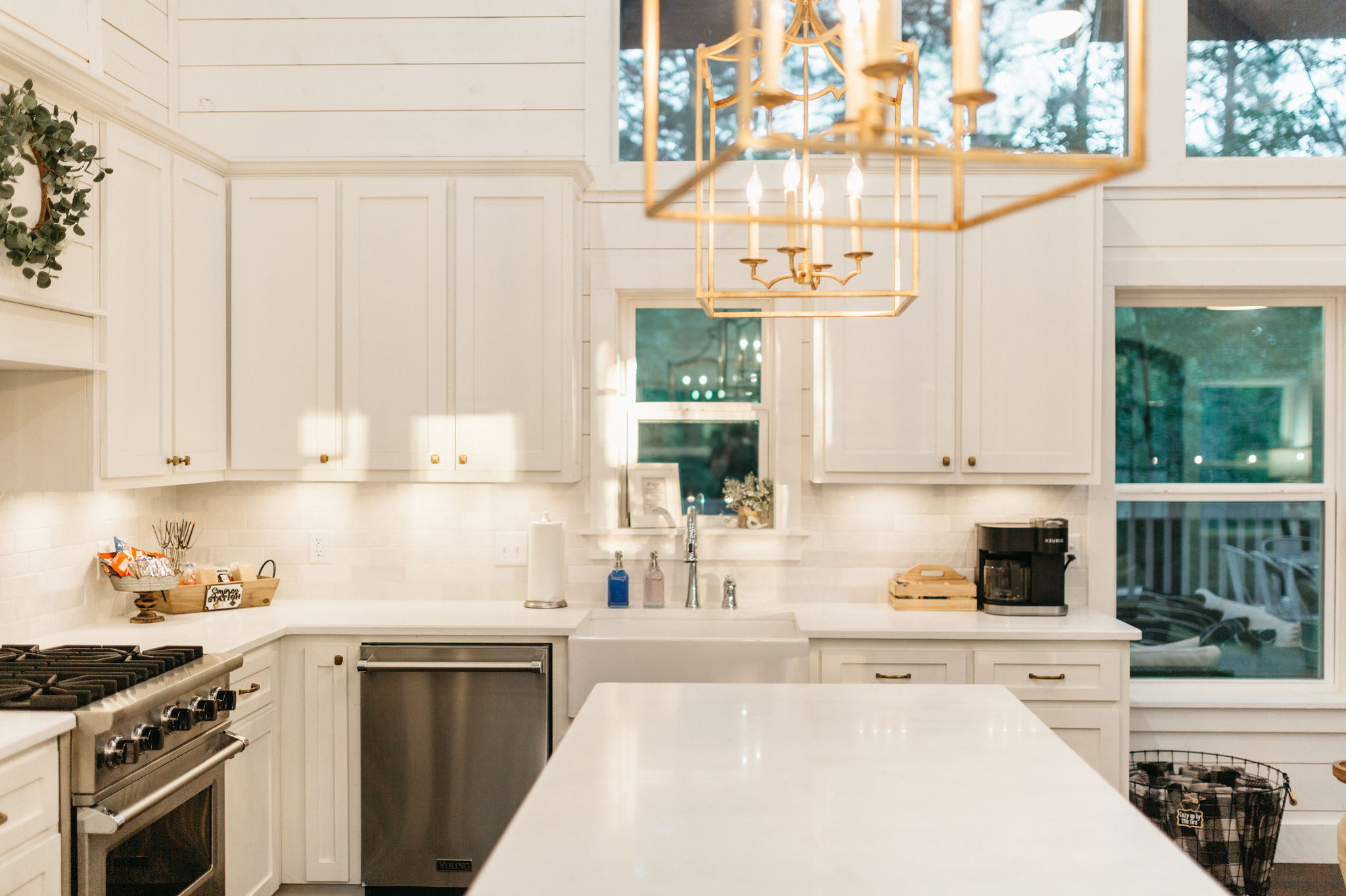 The gourmet kitchen features quartz countertops, stainless steel Viking appliances, farm sink, and oversized island. Everything necessary to prepare and serve a wonderful meal is provided.