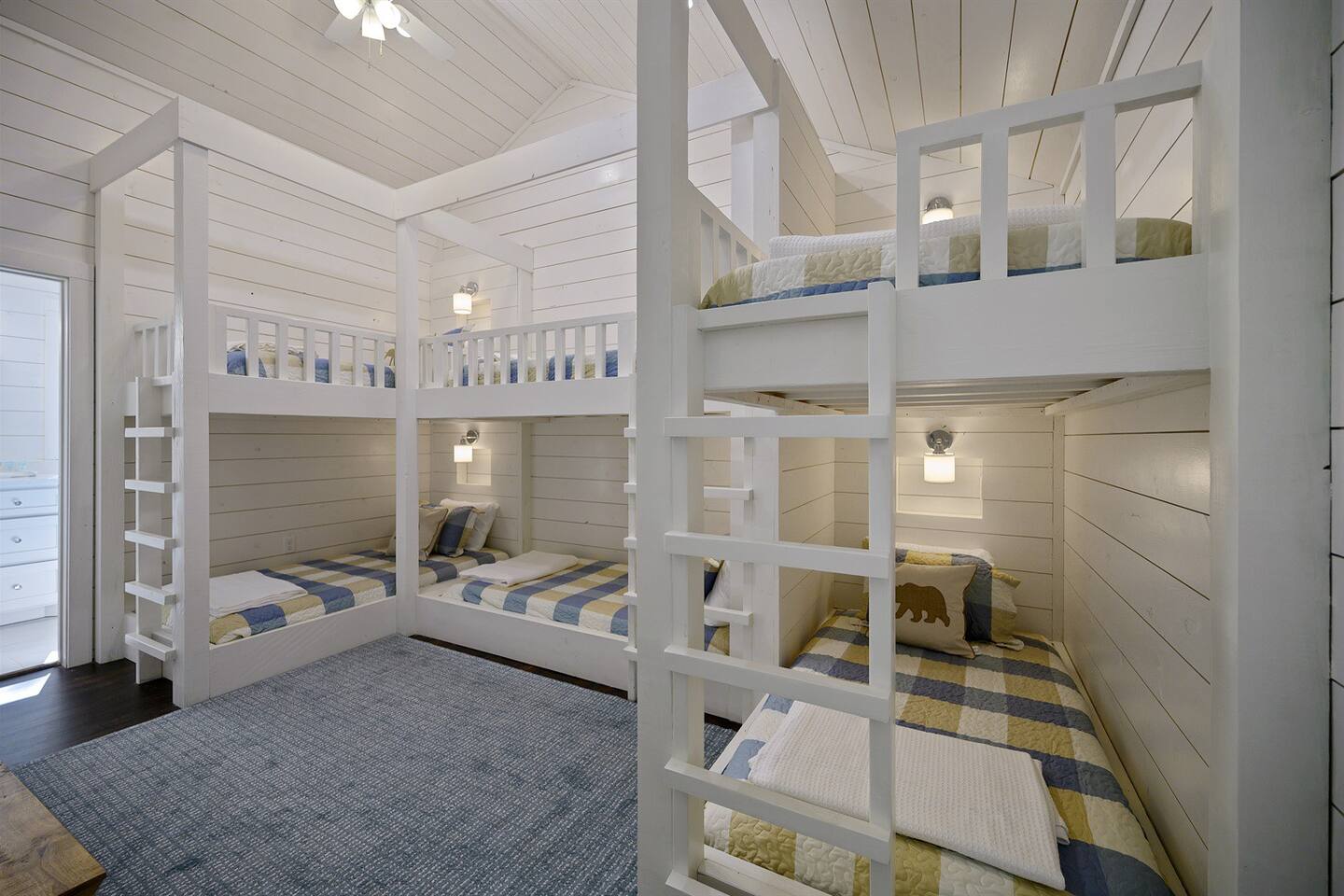 Each bedroom has a king bed with TV and large bathroom. The upstairs bunk room has six built-in bunks with a large entertainment area with oversized, smart TV.