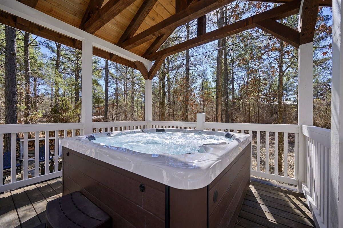 Cottonwood Cottage is a luxury farmhouse on nearly 2 acres of towering pines. Tucked among the trees of the Ouachita National Forest, the cabin is convenient to local dining and attractions, but retains the feel of a remote, secluded haven. Vaulted ceiling in the family area and gourmet kitchen. Two bedrooms with king beds and a bonus bunk room upstairs with six bunks and large tv. Beautiful back patio with outdoor fireplace, large tv, and seating. Connected walkway to the hot tub cabana.