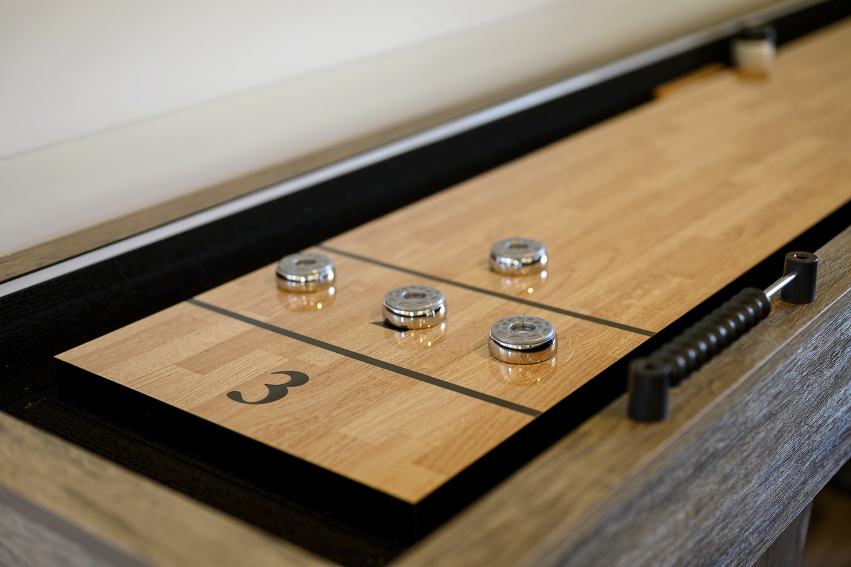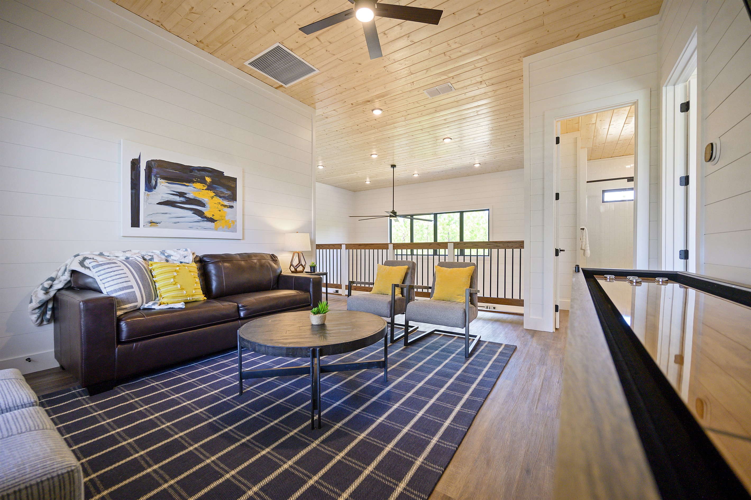 • Upstairs, two more bedrooms and a game room loft await. One bedroom houses four twin bunks and opens onto the upstairs deck, while the other offers a king bed and similar furnishings to the primary bedroom, including a hidden small bunk room for extra fun. The game room loft is the ultimate entertainment space, featuring a TV, a pullout couch, board games, and a shuffleboard table, plus access to the second-story deck for outdoor enjoyment.