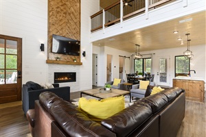 • Welcome to this stunning cabin retreat in Hochatown (also known as Broken Bow), a place that feels like it's straight out of an HGTV magazine! From the moment you step through the glass-paned front door, the soaring ceilings and spacious, open-plan living area greet you with a breath of fresh air. Bathed in natural light, the interior's bright and cheerful palette is an instant mood-lifter. The eye-catching fireplace, with its stylish herringbone wood paneling, reaches towards the ceiling, anchoring the space with its modern farmhouse vibe. The living area is furnished with a plush sectional and three cozy chairs, ensuring there's ample room for everyone to relax and feel at home. The coffee table stands ready for board games or puzzle nights, adding a touch of cozy charm to your stay.