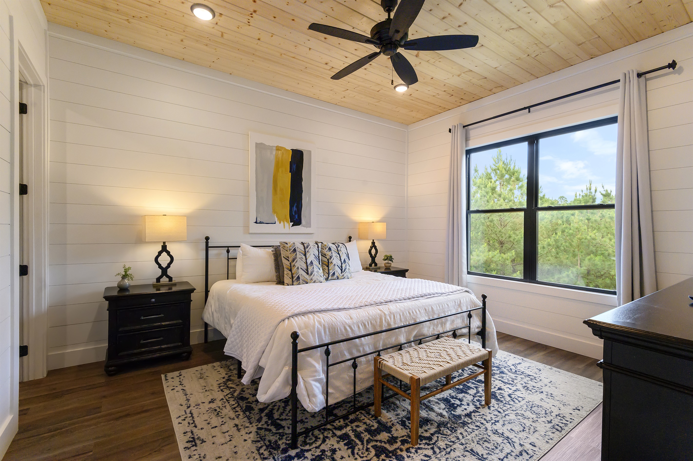 • The primary bedroom on the ground floor is a haven of tranquility, featuring a king-sized bed adorned with luxury linens and blackout curtains for a restful night's sleep. Wake up to serene views of the front porch and the surrounding trees. The room also offers additional seating and a full dresser for your belongings. The ensuite bathroom impresses with a double vanity, a spacious shower, and a closet. For those who enjoy a relaxing soak, the large soaker tub, perhaps accompanied by a glass of wine and a good book, is perfect.