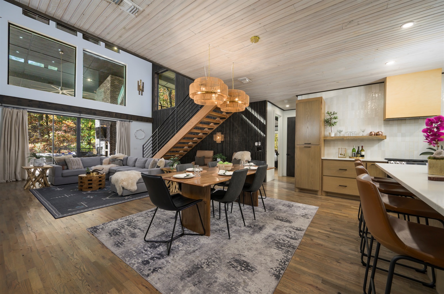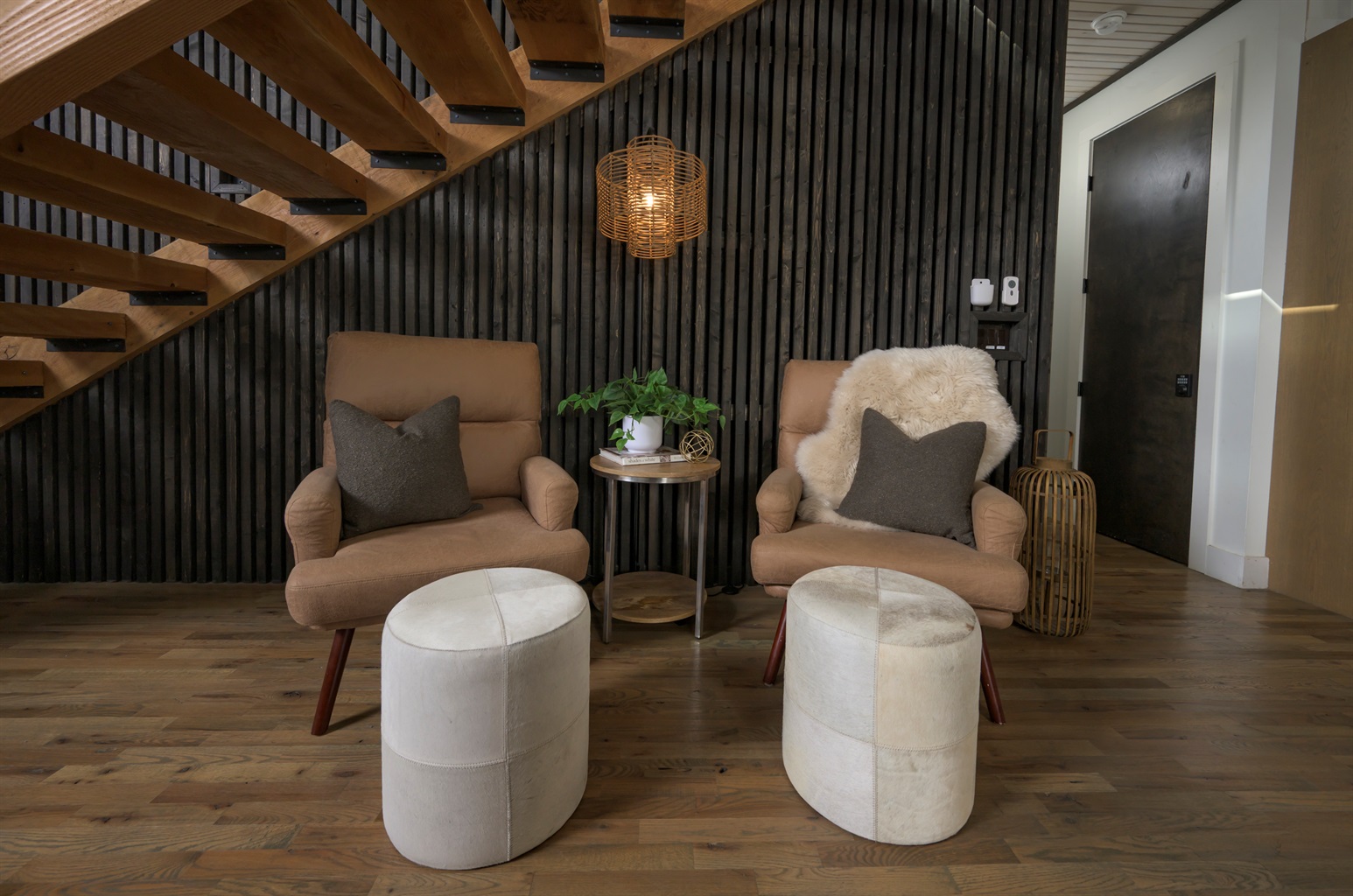 An exquisite blend of materials highlights Enchanted Creeks' aesthetic appeal, from the stone fireplace and floor-to-ceiling slat wall to the floating staircase, teak accents, modern sconces, and hardwood floors. The generous number of windows welcomes the beauty of the outdoors inside, flooding the space with natural light and providing ample seating for relaxation or quality time with loved ones. Designer touches enhance the comfort of the seating, creating a perfect setting for unwinding and savoring the day's offerings. Additionally, a conveniently placed guest bathroom is just steps away from the living and kitchen areas.