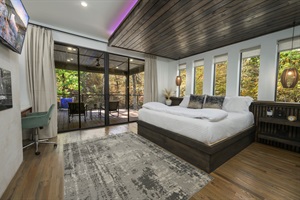 Bedroom 4: King platform bed w/15ft planked ceilings and ceiling fan. Private balcony w/seating. The ensuite bathroom includes a walk-in shower, soaking tub, and stone vanity w/sconces framing the vanity. Built-in desk/chair, nightstands, and wardrobe closet. Includes: Smart HDTV, electric fireplace (sleeps 2)