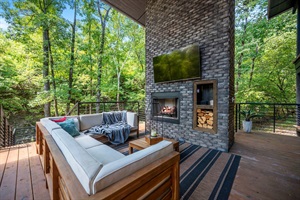 Each of the four master ensuites epitomizes luxury, featuring a king bed with ambient LED overhead lighting, an electric fireplace, a Smart HDTV, custom sconces adorning the bed's frame, built-in nightstands and a dresser, a personal desk with a chair, and a private balcony with seating that overlooks the serene pines and the twin creeks meandering through the property. Each ensuite bathroom exudes a spa-like atmosphere, offering a capacious river rock floor walk-in shower, floor-to-ceiling tile, a stone vanity accented with modern sconces, a relaxing soaking tub, and "his and hers" bathrobes. Two of the master suites are located on the lower level, with the other two situated upstairs. The soothing color palette and rich textures create a welcoming ambiance that soothes both the heart and mind.