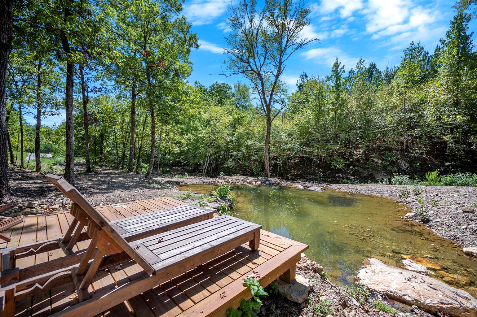 A double sliding glass door in the living area opens up to a captivating 1,500 square-foot covered deck, offering awe-inspiring views. This secluded 1.3-acre oasis boasts a distinctive landscape with two creeks meandering throughout the property, interspersed with granite boulders and a charming bridge that leads to a sun deck overlooking a serene watering hole, all enveloped by majestic pine and hardwood trees.