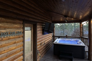 Covered hot tub with forest backdrop