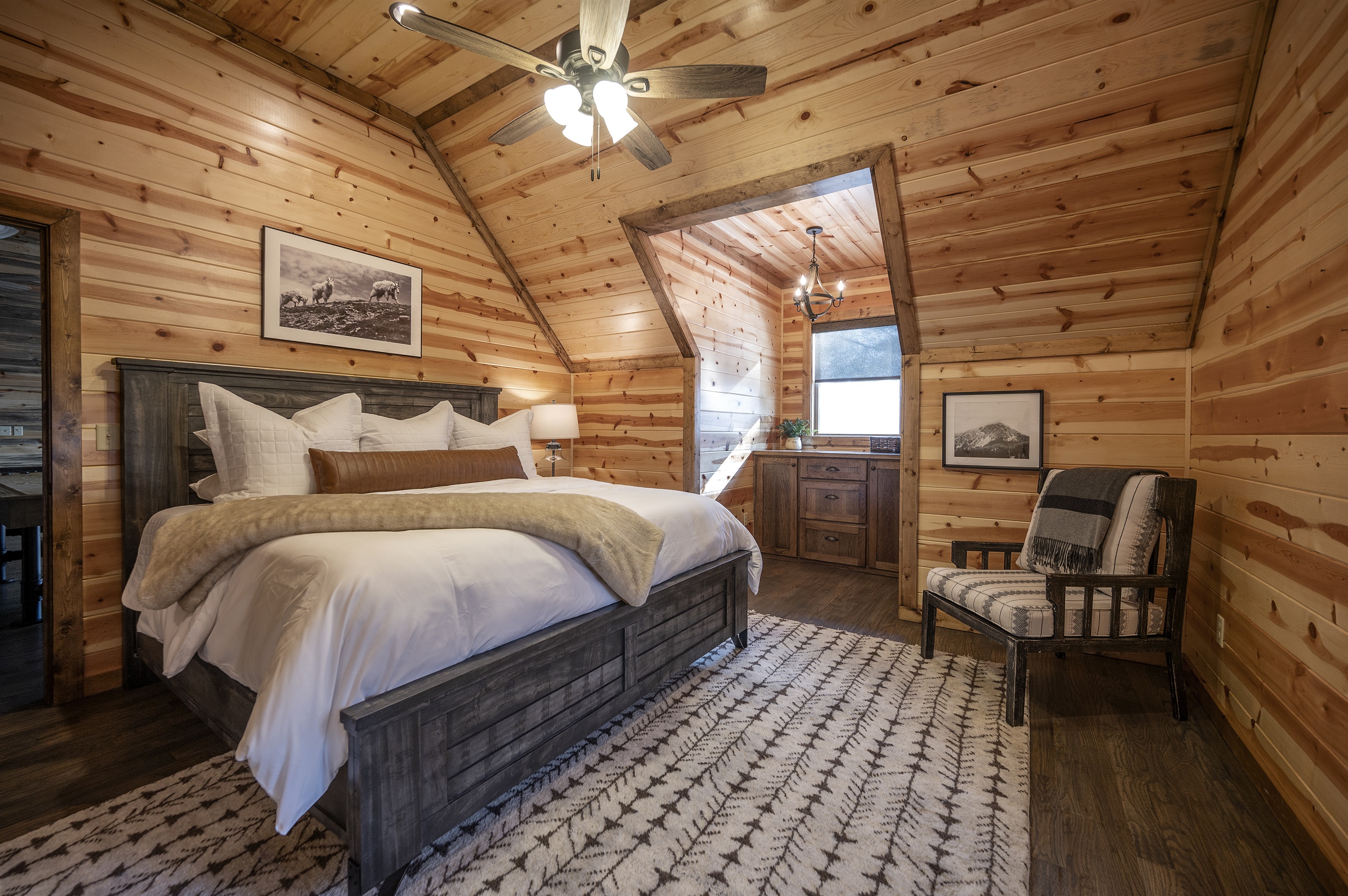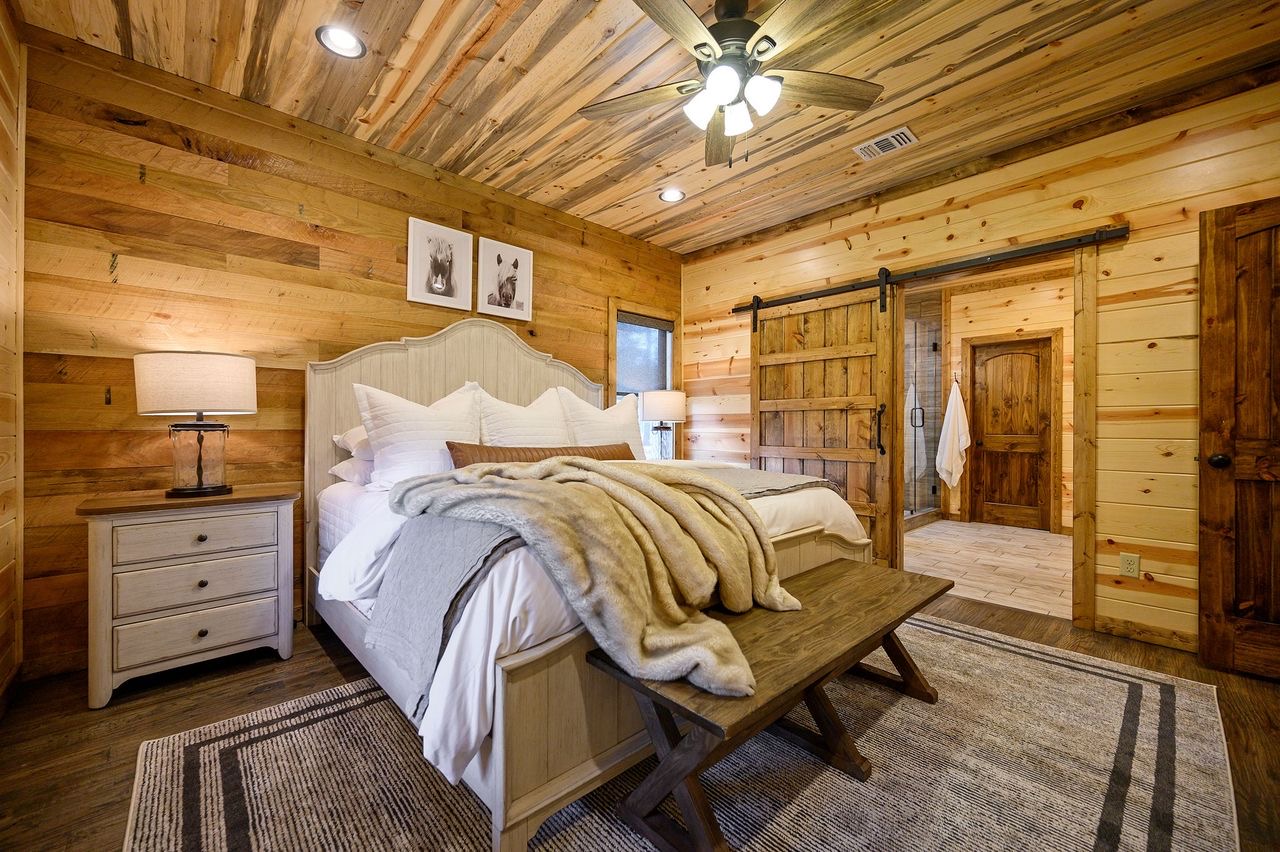 Upstairs guests will find a well-appointed king bedroom with its own private bath with walk-in shower, luxury mattresses, and TV. To the other side of the loft, guests will find the bunk room complete with 2 full over queen bunks to accommodate a total of 8 guests. The bunk room has a private bathroom with a walk-in shower.