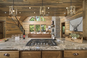 Let's Get Toasted! is convenient to Beavers Bend State Park, Broken Bow Lake and Hochatown area attractions, restaurants and shopping. As you enter the warm, fully furnished cabin, on the main level you'll find an impressive floor-to-ceiling stone gas fireplace. The lodge room showcases a 2-story vaulted ceiling and features a mix of modern and rustic décor. Seating includes two (2) leather sofas and two (2) chairs. The dining room features seating for 14 between the dining table and granite island. The full kitchen includes all the appliances and cookware you'll need to make your favorite meals. In addition, the kitchen offers a butler's pantry that holds a coffee bar and an extra full-size fridge. Around the corner is the laundry complete with two (2) washers and dryers.