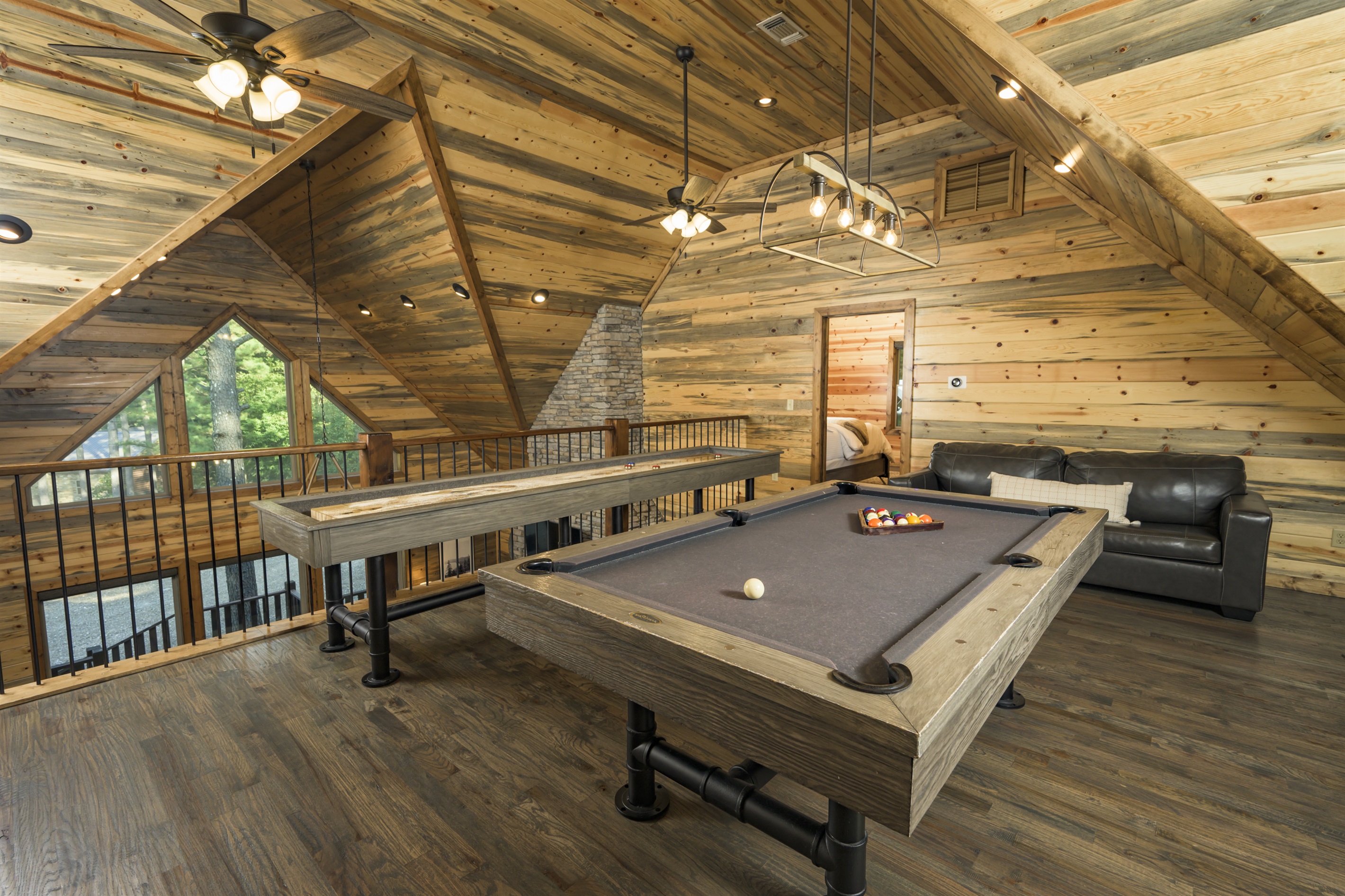 Back inside on the second level there's a loft off the stairs that features a queen sleeper sofa, TV, pool table, shuffleboard, and pub table. Off the game room, you'll have access to a TV room with another queen sofa sleeper enclosed by double barn doors.