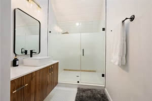 Upstairs, the loft-style second bedroom is designed for both rest and play. This space includes two full-size beds, a nightstand, a TV, and a foosball table for added entertainment. The loft features a private ensuite bathroom with a walk-in rain shower, single vanity, and private toilet — making it a great setup for kids, teens, or additional adult guests.