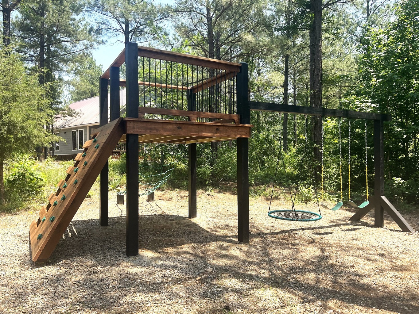 Just steps away, the fire pit with seating for four is perfect for roasting marshmallows, sharing stories, and enjoying peaceful evenings beneath the Oklahoma night sky. Younger guests will love the backyard playset, making Loft in the Moment a truly family-friendly Broken Bow cabin.