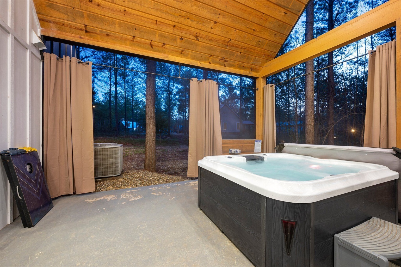 Step outside to enjoy one of the best outdoor living spaces in Broken Bow. The covered deck features an electric fireplace and big-screen TV, creating a cozy space to relax in any weather. Soak in the private hot tub, enjoy patio seating for six, or challenge your group to a game of cornhole.