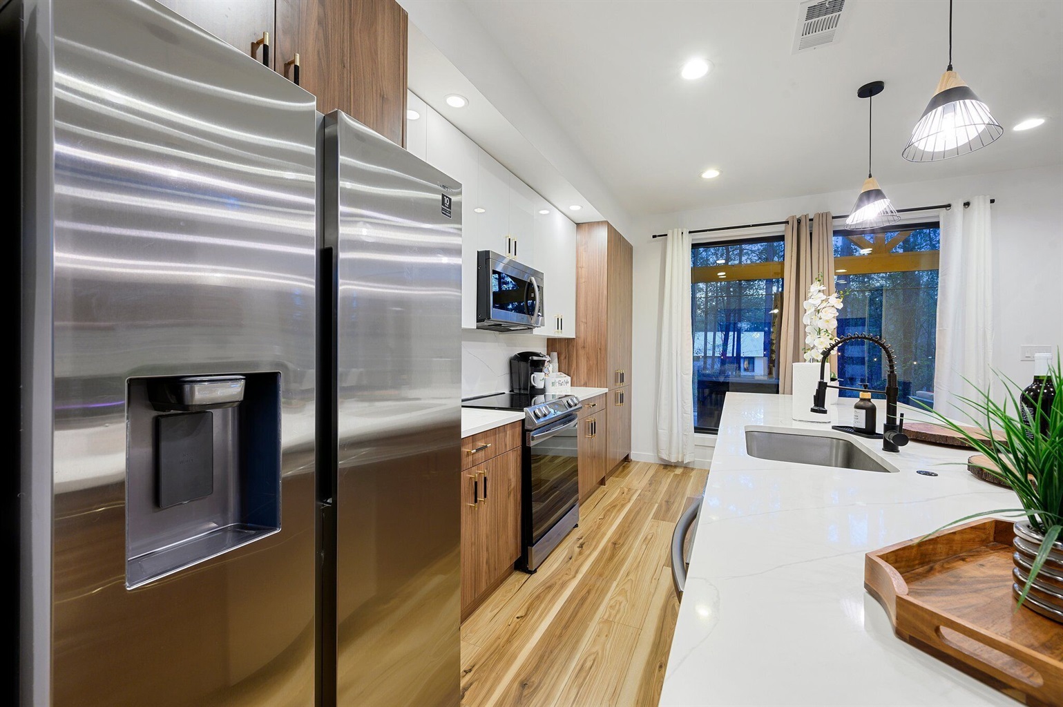 The fully stocked kitchen and dining space are ideal for both quick meals and family-style dining. The dining table seats four, with additional island seating for four more guests. The kitchen includes standard appliances, cookware, flatware, utensils, and Keurig coffee makers with multiple brewing options — everything you need for preparing meals, snacks, and morning coffee at the cabin.