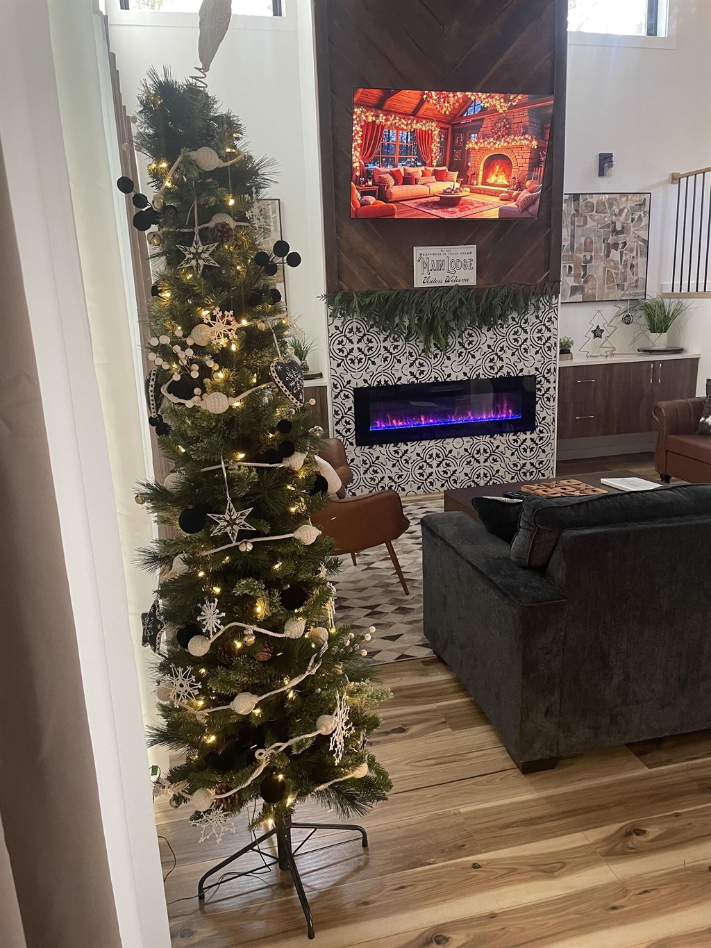 Cozy living room with electric fireplace, big-screen Smart TV, plush sleeper sofa, loveseat, and accent chairs