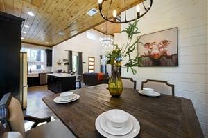 Upon entering the cabin, you will be greeted with an open floor plan that seamlessly connects the living room, kitchen, and dining area. The living room features comfortable seating, a gas fireplace, and a large flat-screen TV with streaming capabilities. The fully equipped kitchen comes with stainless steel appliances, granite countertops, and all the cooking essentials you'll need to prepare a delicious meal. The dining area seats six, making it the perfect spot for intimate dinners or game nights.