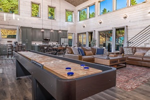 Enter the great room, a breathtaking space with soaring 25-foot ceilings and a wall of windows that seamlessly blend the indoors with the beauty of the forest. The open layout invites everyone to gather, whether around the luxurious lounge sofa, the unique ball fireplace, or the massive 85-inch Google Smart TV. The Gourmet Kitchen is a chef’s dream, boasting a 10-foot island with seating for six, a nook table for four by the coffee station, and a stunning dining table for eight illuminated by a wagon wheel chandelier.