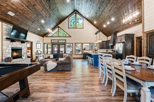 Escape to the hidden gem of Peaceful Easy Feeling, a one-level vacation retreat that will instantly embrace you with its name. Discover the spacious open floorplan, thoughtfully designed with intimate areas to gather. Sink into the large comfy sofa by the fireplace for movie nights or sports excitement. Indulge in pure relaxation on the giant beanbag chair or create lasting memories around the dining table with meals and board games. The pool table, accompanied by high-top table seating, offers a delightful view of the TV. With three ensuite bedrooms, including cozy bunk beds, everyone will find their haven.