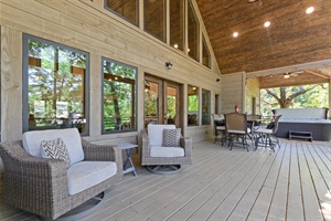 ◆ Hot tub on the elevated back deck, along with a grill, dining table, and lounge area by the stone fireplace with TV