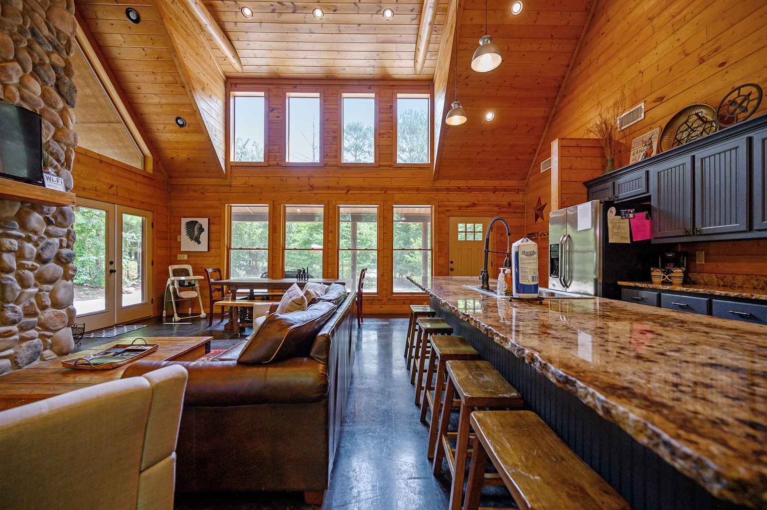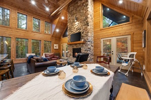 Nestled among the towering trees of Broken Bow, OK, this cozy cabin offers a seamless blend of indoor comfort and outdoor beauty, making it an ideal destination for Broken Bow cabin rentals. When you walk through the front door, you're welcomed by an open-concept living area featuring floor-to-ceiling windows, allowing you to feel connected to the natural beauty of Hochatown. The stone fireplace is the focal point, providing a cozy gathering spot for family and friends. Whether you’re enjoying a movie or relaxing by the fire, this Broken Bow cabin is the perfect space to unwind.