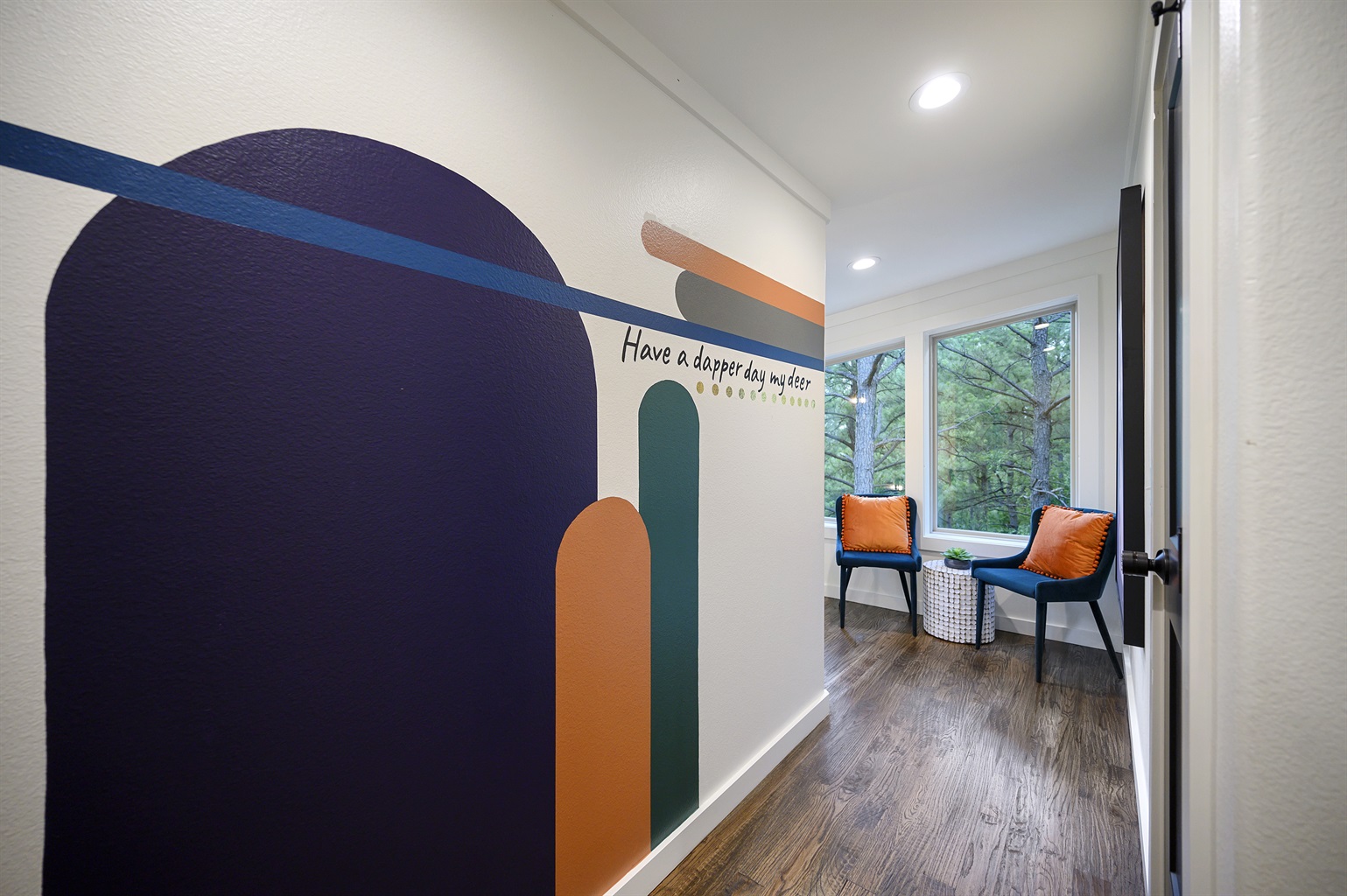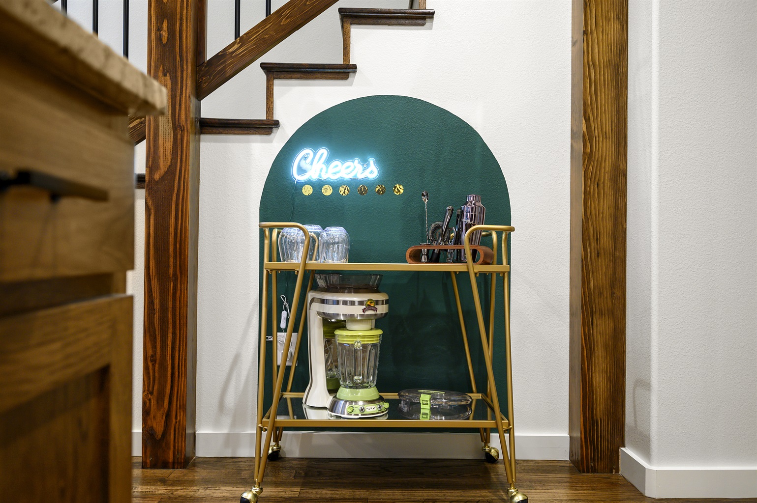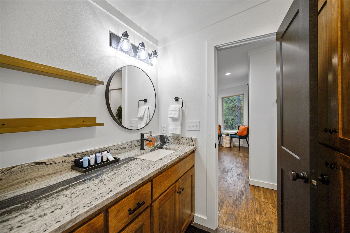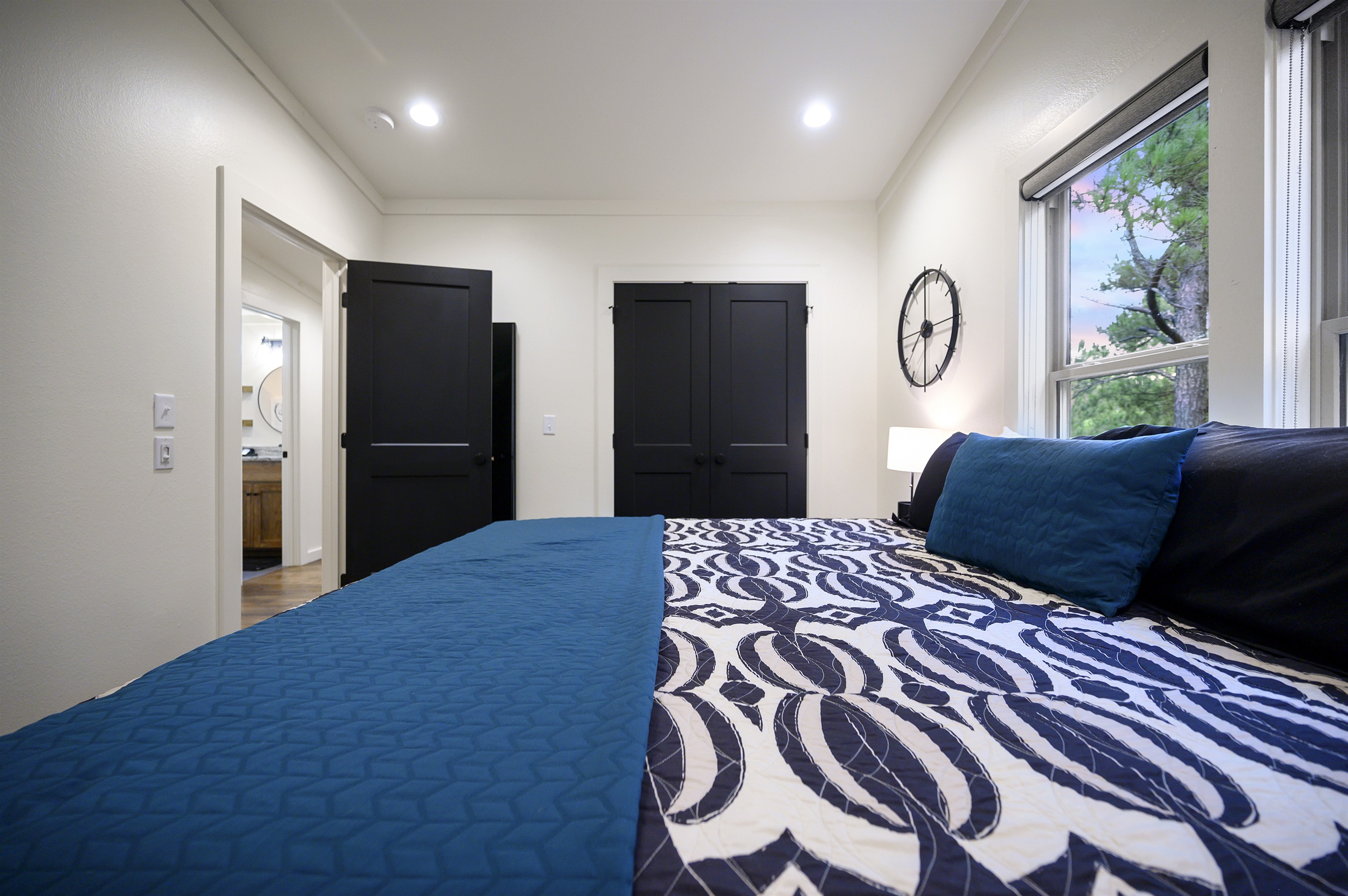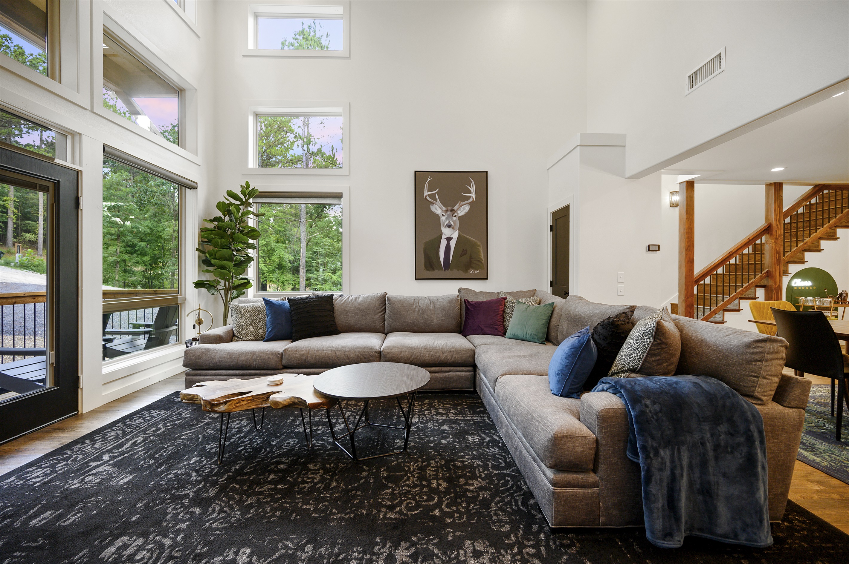 The Dapper Deer will comfortably sleep up to 8 guests. The Master bedroom located on the first floor features a spacious king size bed, luxury linens, a walk-in closet, and smart TV. The adjoining bathroom suite has a high end shower and soaking tub, a double vanity, and a walk in closet. The other two bedrooms are located on the 2nd floor. The second bedroom has a king-size bed. The third bedroom has a queen-size bed, a bunkbed (full on bottom/twin on top). The upstairs bedrooms share a large bathroom with a shower and tub combo and vanity with a very spacious countertop.