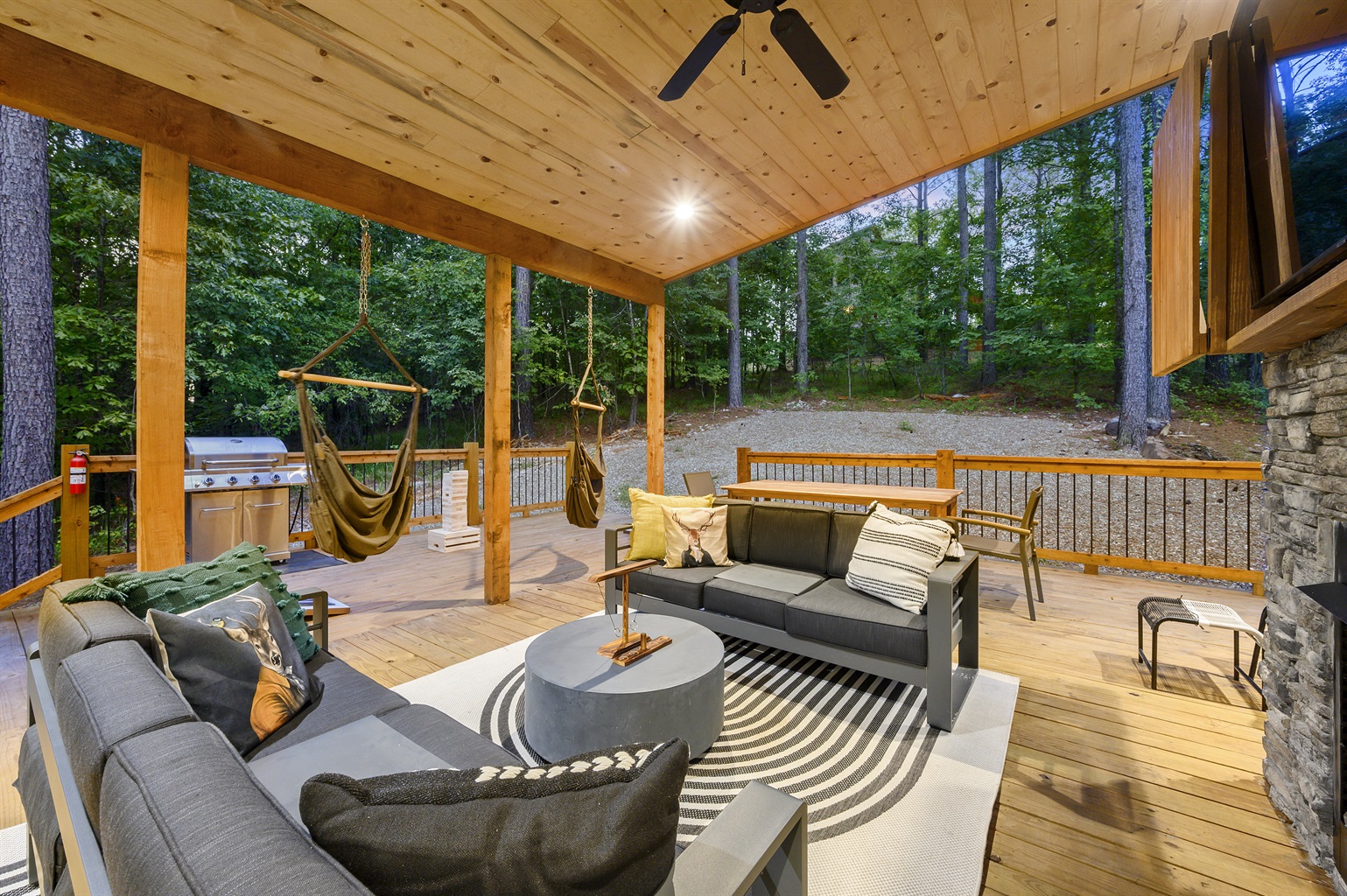 You can access the covered main deck patio area from the master bedroom and living room. While enjoying the outdoors you can watch your favorite show on the smart TV located over the fireplace. The beautiful deck includes a covered hot tub located at the rear of the deck for privacy. A part of the deck is uncovered which is a perfect space for outdoor games. You will also find a gas grill just perfect for grilling a feast for all your friends and family.