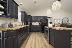 The dining table seats 10-12 guests, with additional seating at the kitchen island. Whether enjoying a charcuterie board with cocktails, gathering for meals, or playing games at the table, there's enough room for everyone in your group. The kitchen, featuring gorgeous butcher block counters, is open to the dining and living room, ensuring the chef is always part of the conversation and fun.