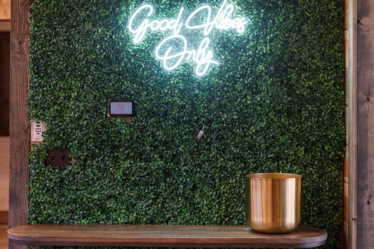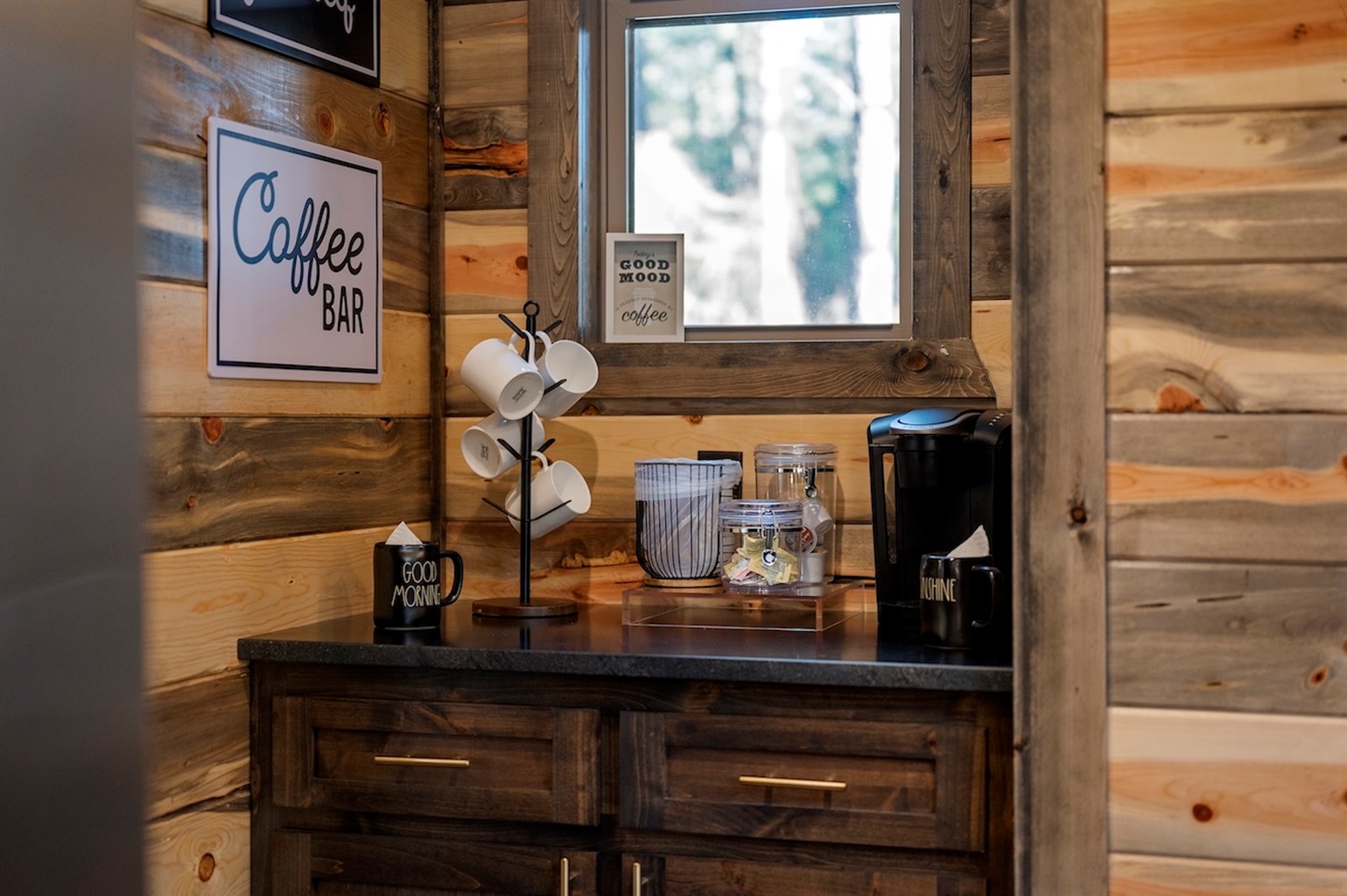 🏡 LIVING AREA: Step inside and be amazed by the modern rustic decor, open floorplan and views of the surrounding forest! There is also an IG-worthy wall in the living space where you can take photos.