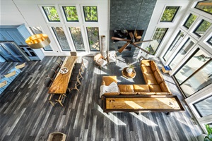 Upon entering the contemporary cabin, you'll be welcomed by an expansive wall of windows. These sleek, black-framed windows act like living picture frames, showcasing the treetops and the beauty of nature outside. The wood floors and ceiling harmonize with the modern stone fireplace and the inviting leather furniture, creating a harmonious and cozy atmosphere. Enjoy a game of shuffleboard, relaxing by the fire, or snuggle up to watch a game or late-night movie.