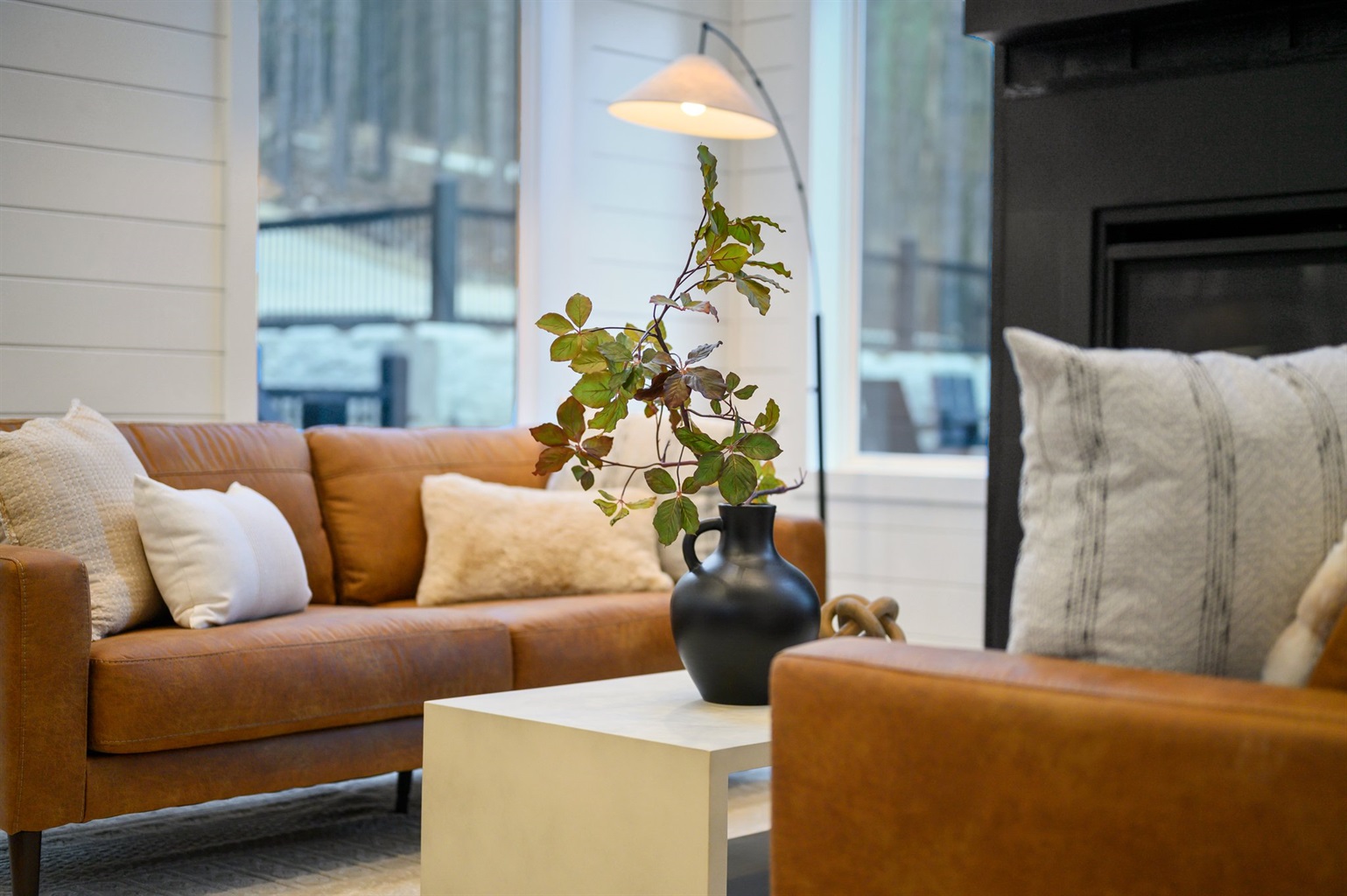 The living area is the perfect place to unwind, boasting a cozy gas fireplace, a smart TV, and comfortable leather furniture where you can enjoy your favorite streaming services. A hallway leads to a convenient half bath and a washer/dryer area.