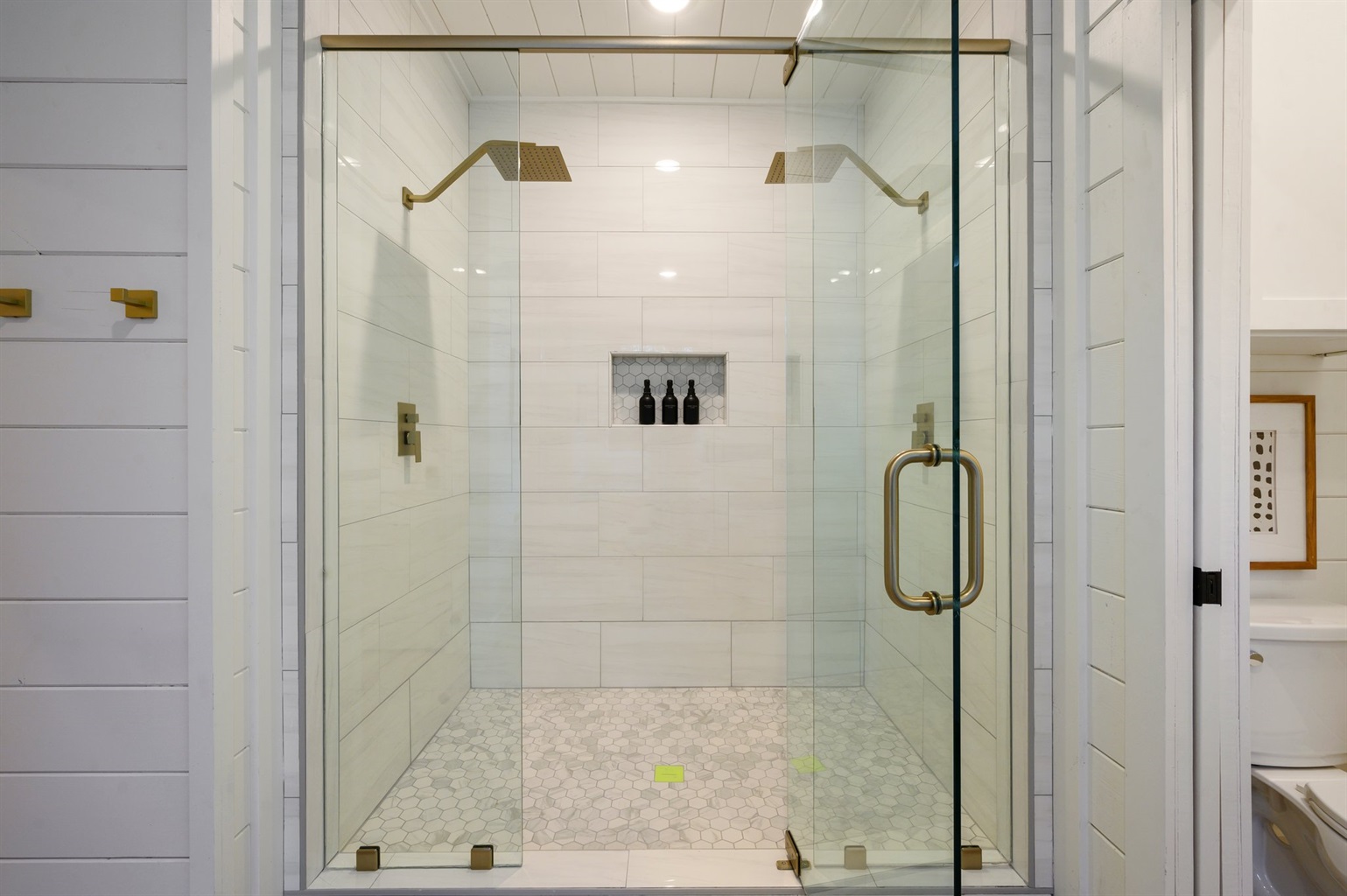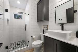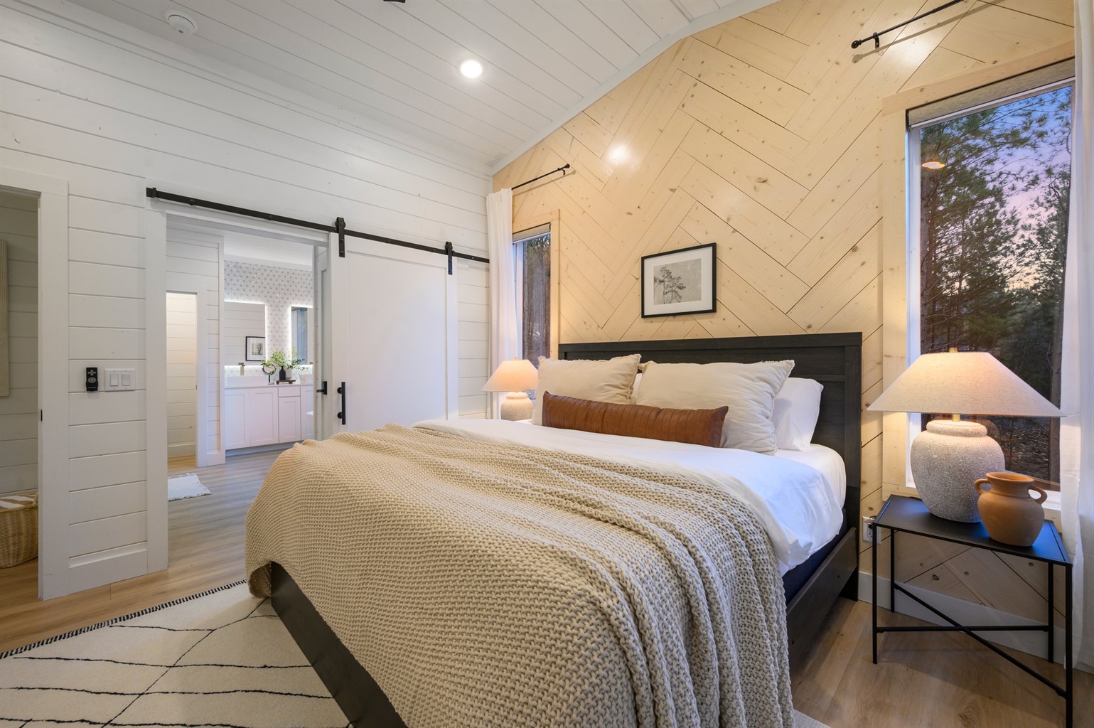 Retreat to the main bedroom, adorned with plush bedding and darkening shades for a restful night's sleep. French doors lead out to the back patio, where you can soak in the serene views of the pines. The large bathroom boasts backlit dual vanities, a luxurious soaking tub, and a dual head shower for ultimate relaxation.