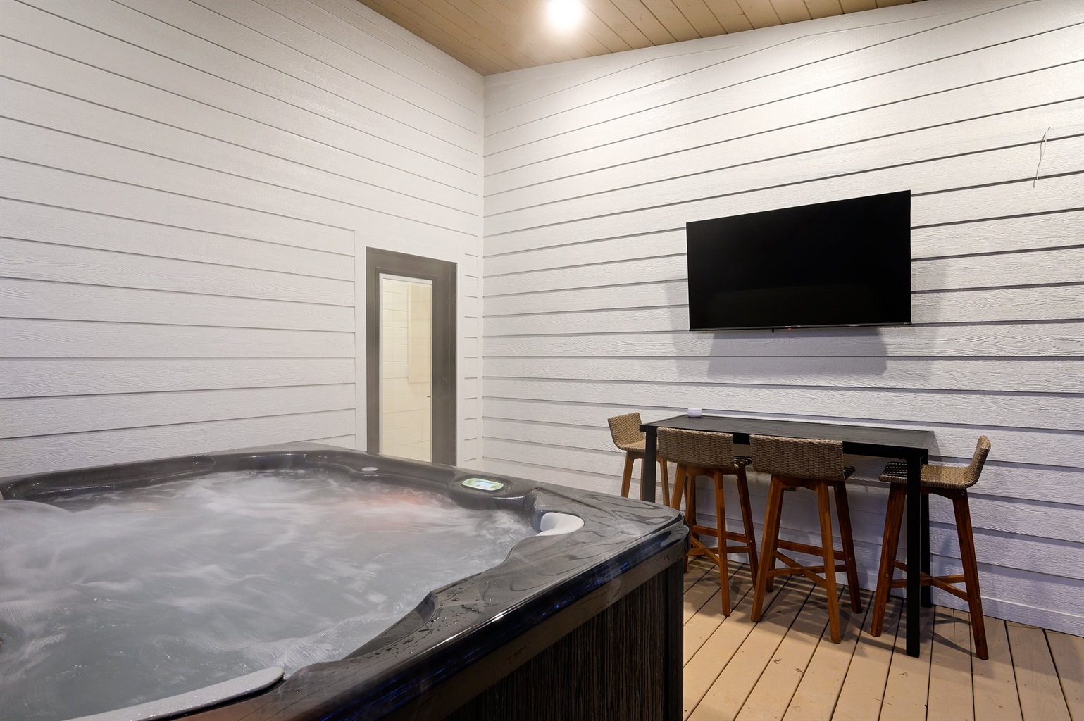 Outside, guests can enjoy a gas grill for outdoor cooking, a soothing hot tub, a firepit for roasting marshmallows and storytelling, and large beam swings for leisurely afternoons in the fresh air.